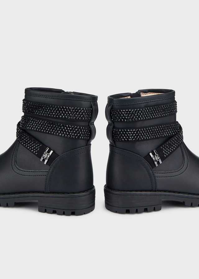 Mayoral μποτάκια λουράκια τρουκς μαύρο χρώμα για μοδάτα κορίτσια που θέλουν να τραβούν τα βλέμματα. Εξωτερικά είναι κατασκευασμένα από συνδυασμό υλικών γνήσιο δέρμα και eco δέρμα και εσωτερικά έχουν βαμβακερή επένδυση και δερμάτινο εσωτερικό πάτο, επίσης η ανατομία τους προσφέρει απαλότητα και άνεση στο περπάτημα. Είναι διακοσμημένα με εντυπωσιακά λουράκια σε μαύρο χρώμα με μικρά μαύρα τρουκς. Επίσης διαθέτουν φερμουάρ από την εσωτερική μεριά του ποδιού. Έχουν μαλακό και ελαφρύ πάτημα καθώς η αντιολισθητική σόλα τους είναι κατασκευασμένη από καουτσούκ. Ιδανική επιλογή για άνεση με στυλ για όλες τις περιστάσεις καθότι είναι πολύ στιλάτα και άνετα!