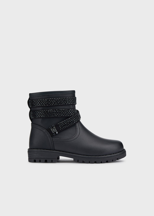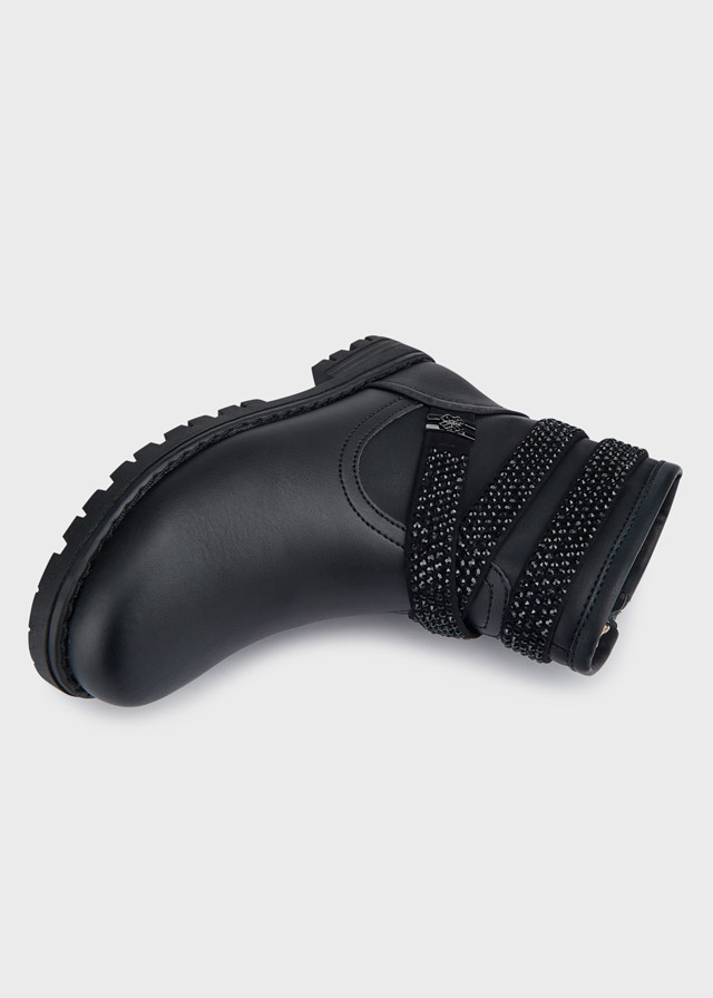 Mayoral μποτάκια λουράκια τρουκς μαύρο χρώμα για μοδάτα κορίτσια που θέλουν να τραβούν τα βλέμματα. Εξωτερικά είναι κατασκευασμένα από συνδυασμό υλικών γνήσιο δέρμα και eco δέρμα και εσωτερικά έχουν βαμβακερή επένδυση και δερμάτινο εσωτερικό πάτο, επίσης η ανατομία τους προσφέρει απαλότητα και άνεση στο περπάτημα. Είναι διακοσμημένα με εντυπωσιακά λουράκια σε μαύρο χρώμα με μικρά μαύρα τρουκς. Επίσης διαθέτουν φερμουάρ από την εσωτερική μεριά του ποδιού. Έχουν μαλακό και ελαφρύ πάτημα καθώς η αντιολισθητική σόλα τους είναι κατασκευασμένη από καουτσούκ. Ιδανική επιλογή για άνεση με στυλ για όλες τις περιστάσεις καθότι είναι πολύ στιλάτα και άνετα!